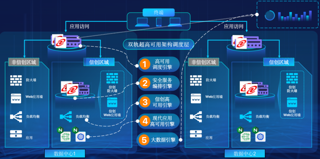 William希尔体育在企业面临自主创新IT基础重构过程中,推出的全新架构双轨超高可用架构(简称DTMAA),在双活数据中心的分区调度基础上,添加每个数据中心内信创域和非信创域的分域调度,来实现分区分域协同的多活双轨超高可用。